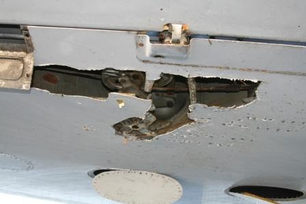 ![]() Figure 6 – Jerry Swearingen shows off the aft passenger compartment ![]() Figure 7 – Youngsub Beck With Wing Root Fairings ‘Before’ And ‘After’ Restoration ![]() Figure 8 – Gary Bovey and Jeral Godfrey setting up the new flat screen presentation display In the Comet interior, the major event of the year was completion of the Aileron Control Bay exhibit. This compartment, with its clear acrylic floor panels, clearly reveals the Comet designer’s great care backed up by the many redundant safety features built into the Comet’s fly-by-hydraulics aileron control. Also, a carefully made ‘look-alike’ beam fabricated to duplicate DH practice structurally supports the aisle center acrylic panel. Attention was given to reproducing all major cables, hydraulic lines and servo linkages in this compartment. A track light system using custom designed LED sources (to avoid incandescent lamp burnout) highlights the compartment’s features, including the cabin pressure regulator assembly. Man-months of work beginning more than a decade ago are vindicated by the visually striking final result. ![]() Figure 9 – Jeral Godfrey and Gary Hopper with the Aileron Control Bay - to - Aft Baggage Compartment Barrier --- before (right) and after (left) ![]() Figure 10 – Aileron control bay during restoration ![]() Figure 11 – Aileron Control Bay viewed through its clear acrylic floor panel Further work in the hangar concentrated on restoration of two port wing flaps, which were found to be in very poor condition with cracks and advanced corrosion. The inboard flap’s trailing edge has a milled aluminum wedge strip which exhibited the corrosion seen in Figure 11, but we did not have the resources to duplicate the part. Then, our Scottish volunteer again came to the rescue! He talked a friend into removing the same strip from a decommissioned Nimrod flap and mailed the part to us. Elsewhere, the flap panel’s many cracks and patches required a surprisingly large time commitment. To finish flap restoration, we plan to build temporary flap bead blasting chambers in 2012 to clean up leading edges. After that, the panels will be corrosion protected and stored in the hangar’s dry environment. ![]() Figure 12 – Port inboard flap trailing edge – before restoration ![]() Figure 13 – Port inner flap trailing edge – during restoration ![]() Figure 14 – Al Horne with Finished Flap Trailing Edge Last year’s progress is due to the dedicated efforts of many Museum of Flight volunteers, for whom we give enthusiastic thanks: